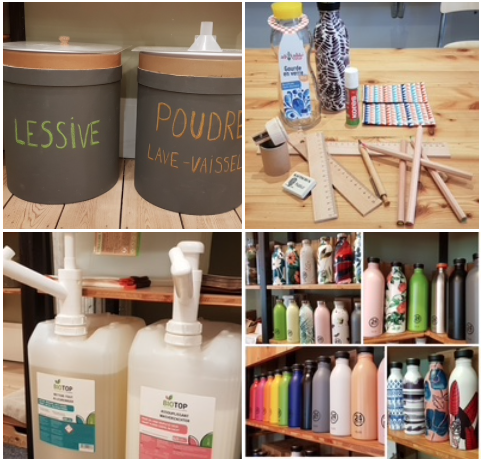 De la poudre de lessive, de lave-vaisselle, du liquide vaisselle, des brosses vaisselle, du nettoie-tout, des gourdes, des bases pour faire ses produits de nettoyage soi-même (bicarbonate et cie) ... en vrac ou non emballé quand c'est faisable !